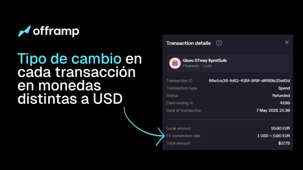 Convierte instantáneamente criptomonedas u otras divisas a USD en tu tarjeta Offramp, sin límites ni comisiones.