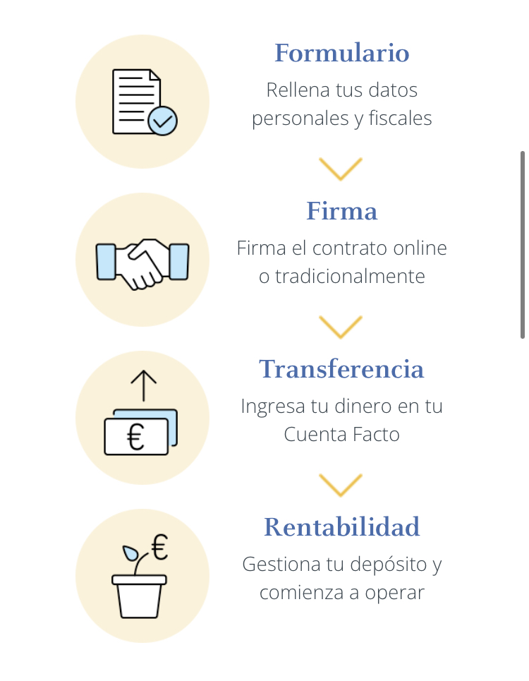 ‼️ Una de las desventajas de la cuenta facto es que hay una cantidad mínima a depositar: Tendrás que depositar al menos 5.000€.