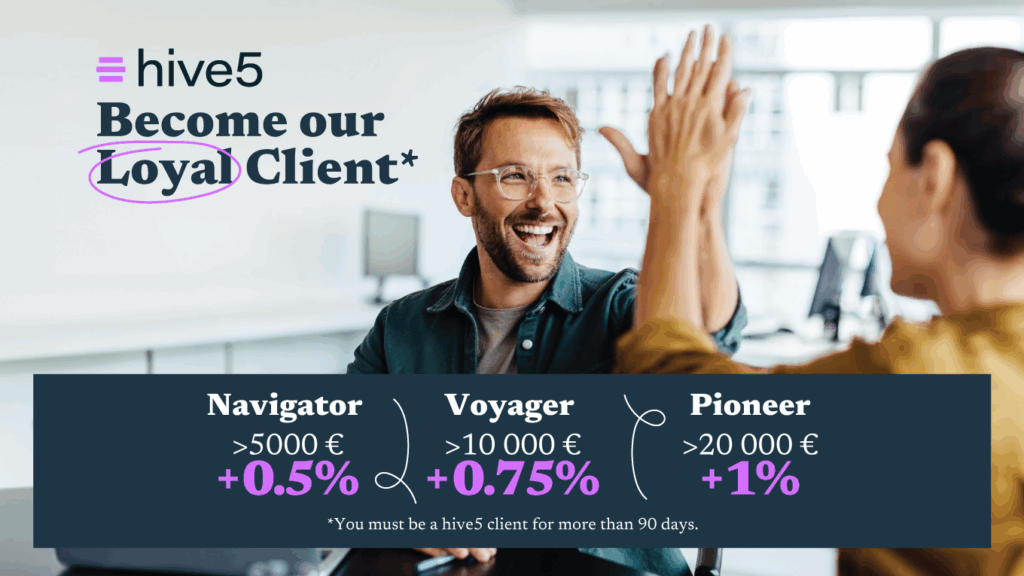 🎁 Si eres cliente de Hive5 durante más de 90 días e inviertes más de 5.000€, participarás automáticamente en el programa de lealtad y recibirás un bonus adicional.