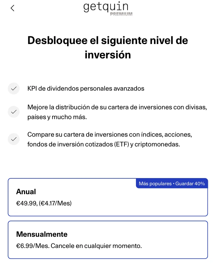 Getquin está disponible de forma gratuita con algunas limitaciones, también dispone de una tarifa premium con coste mensual o anual, que incluye funciones adicionales.