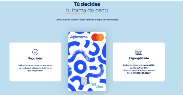 Tipos de modalidades de pago de la tarjeta Aplazame de WiZink